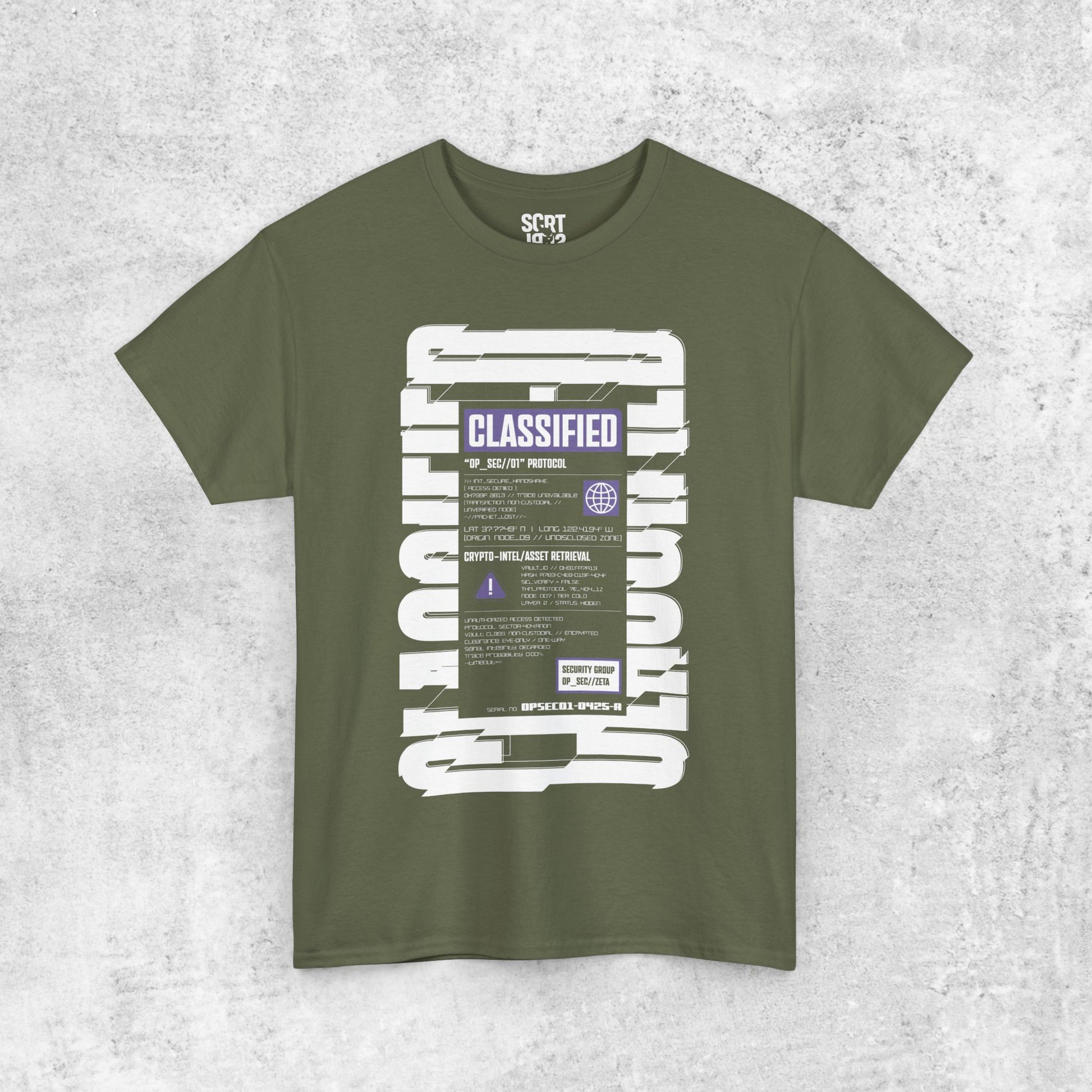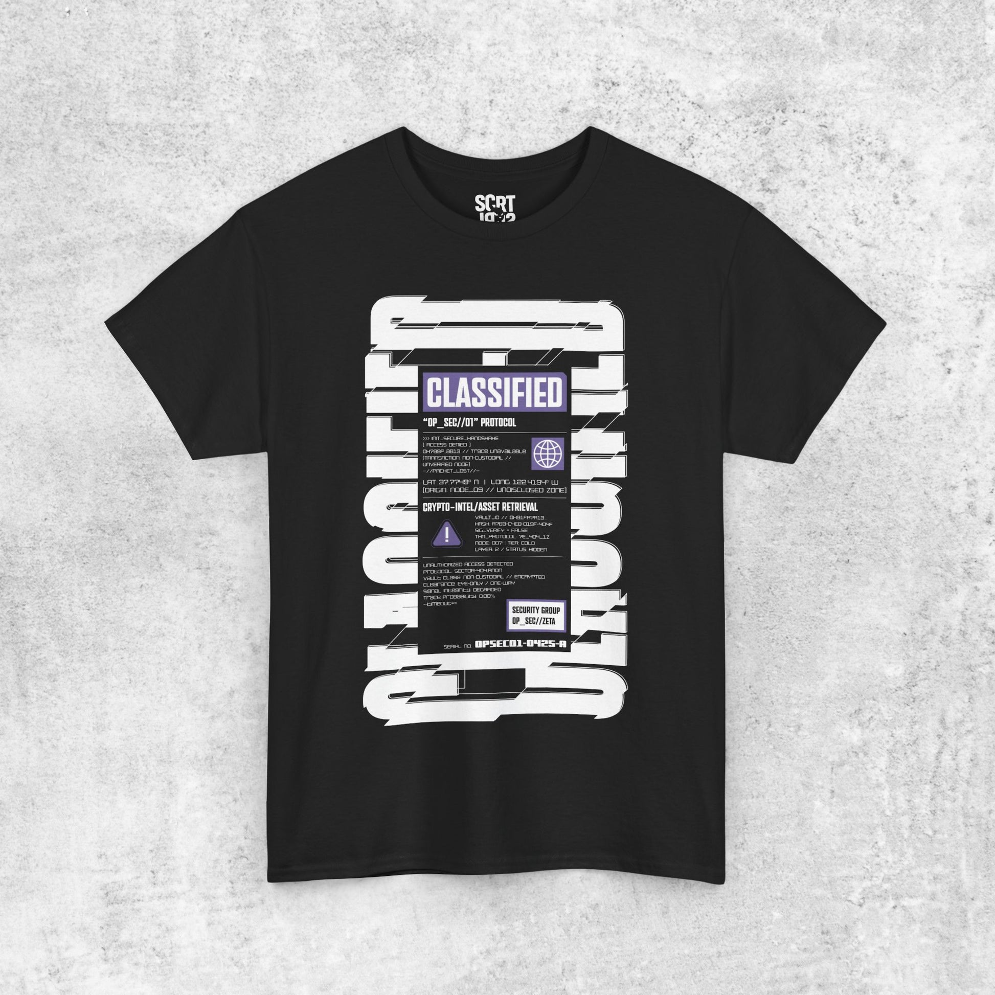The “Classified” Tee is your entry key to the encrypted underground. Featuring a glitch-styled front print that mimics a redacted top-secret document and accented with subtle hits of purple, this design is built to stand out in silence.
