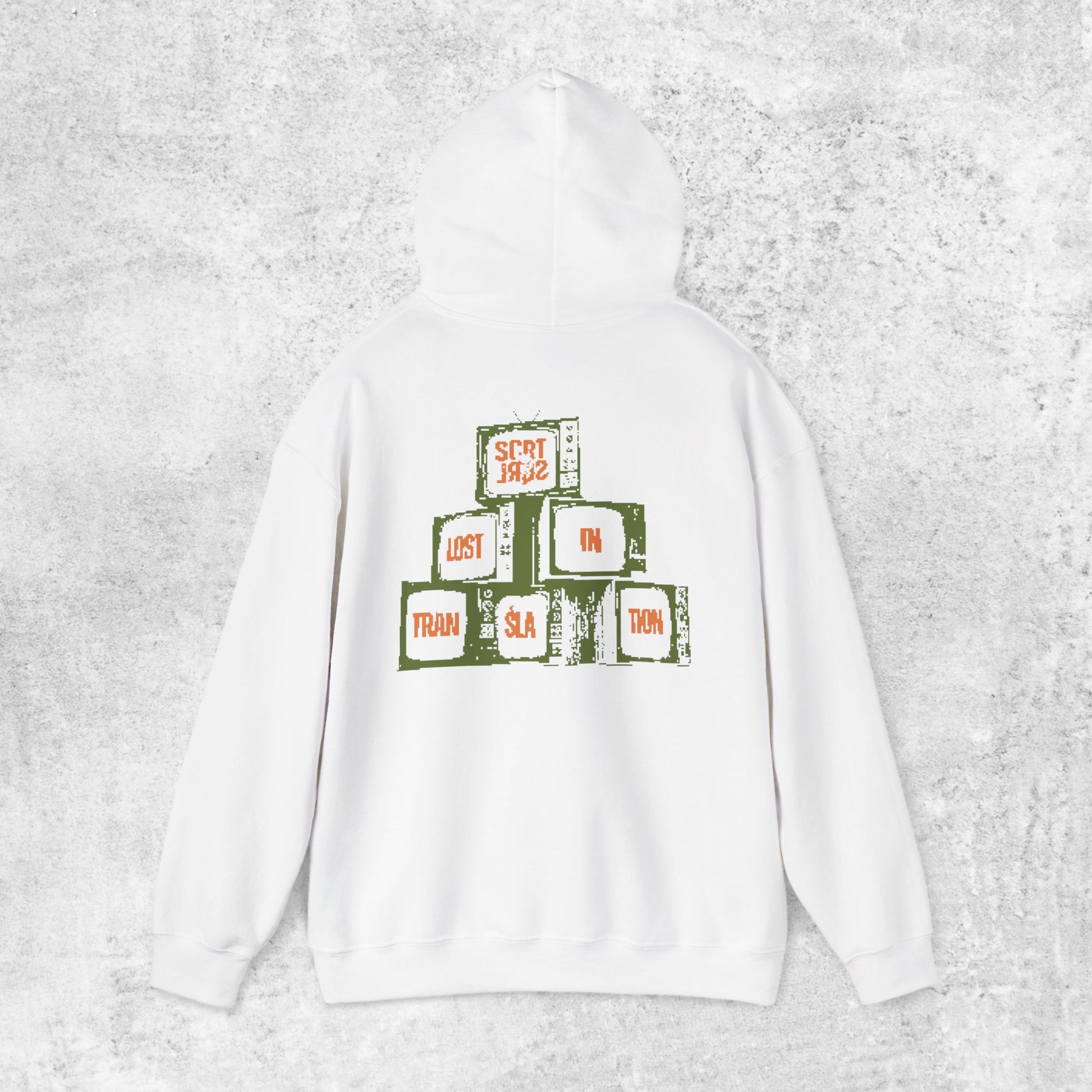The “Lost In Translation” Hoodie is a heavy signal trapped in the static. Up front, a chest-level SCRT SQRL TV screen locks in your broadcast ID. On the back, a wall of stacked CRTs glitches out the phrase LOST IN TRANSLATION — fragmented, distorted, and dripping with analoginter ference.