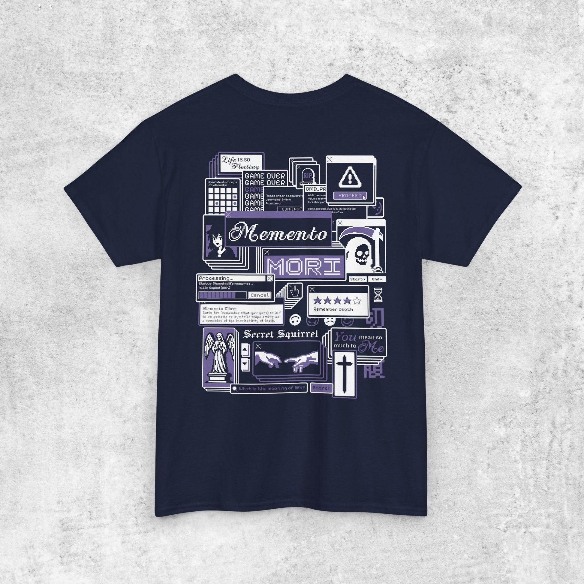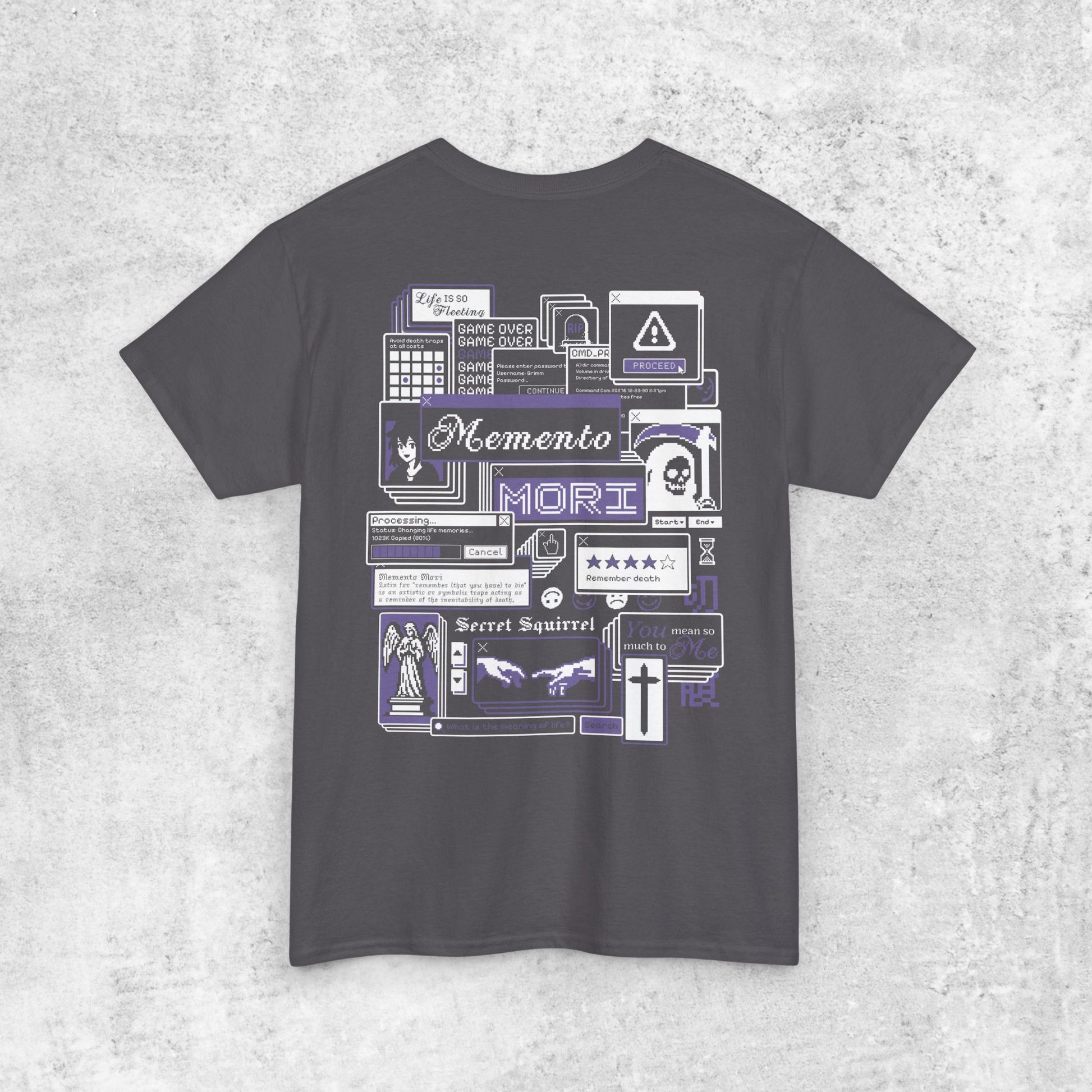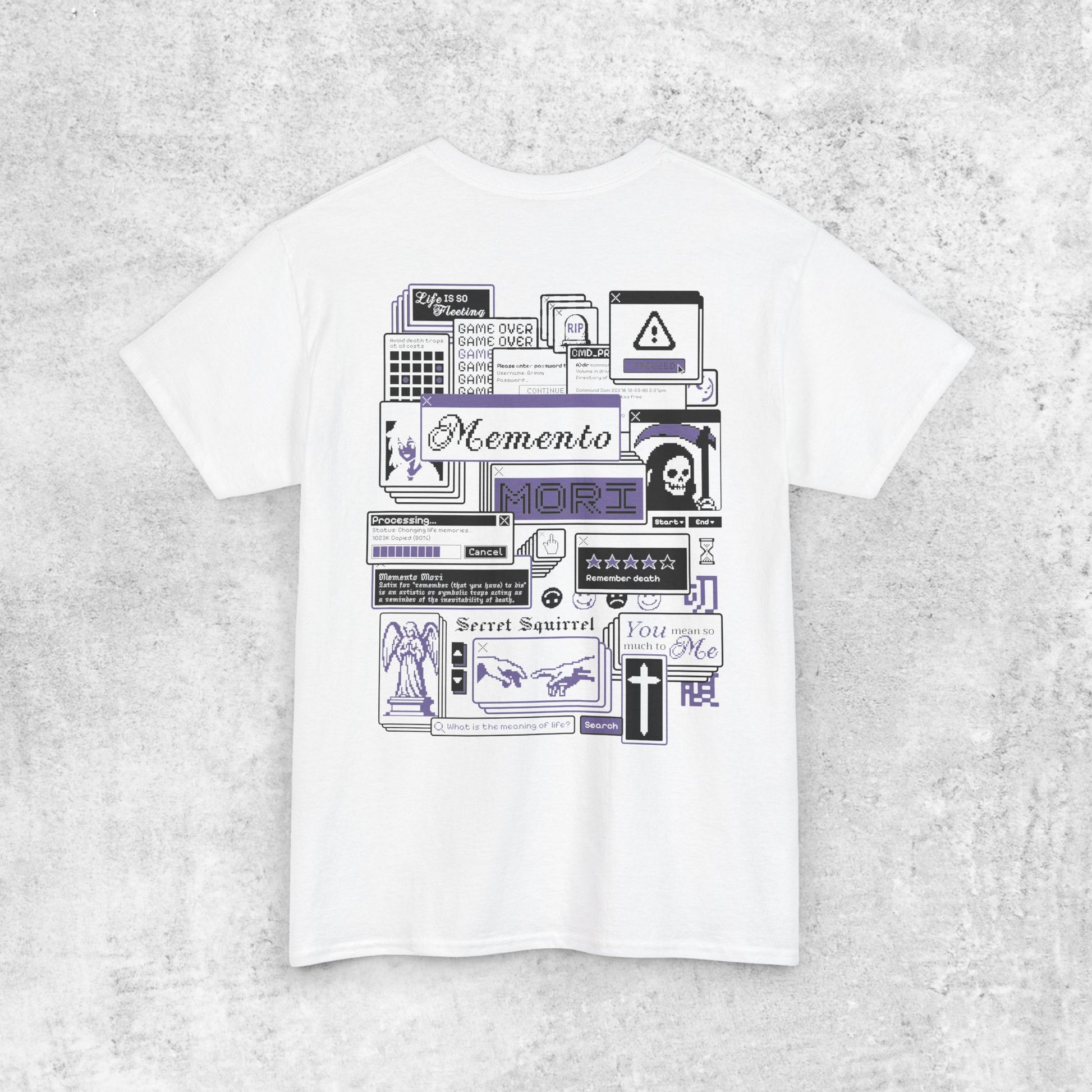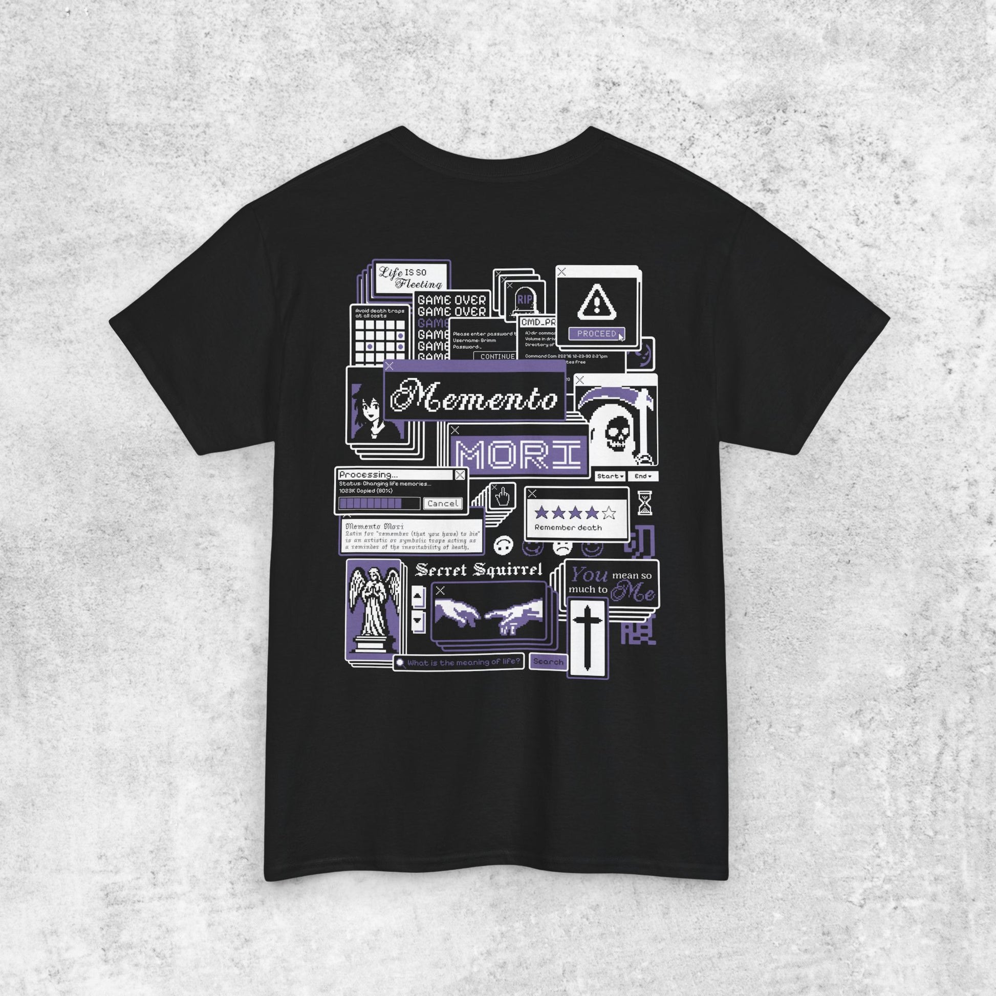 The “Memento Mori” Tee is a glitch-glazed reminder that time is finite and your story is code. Featuring a striking front graphic of overlapping digital windows, retro error messages, a pixel skull, and bold purple-accented highlights, this piece fuses mortality with machine language in true underground fashion.