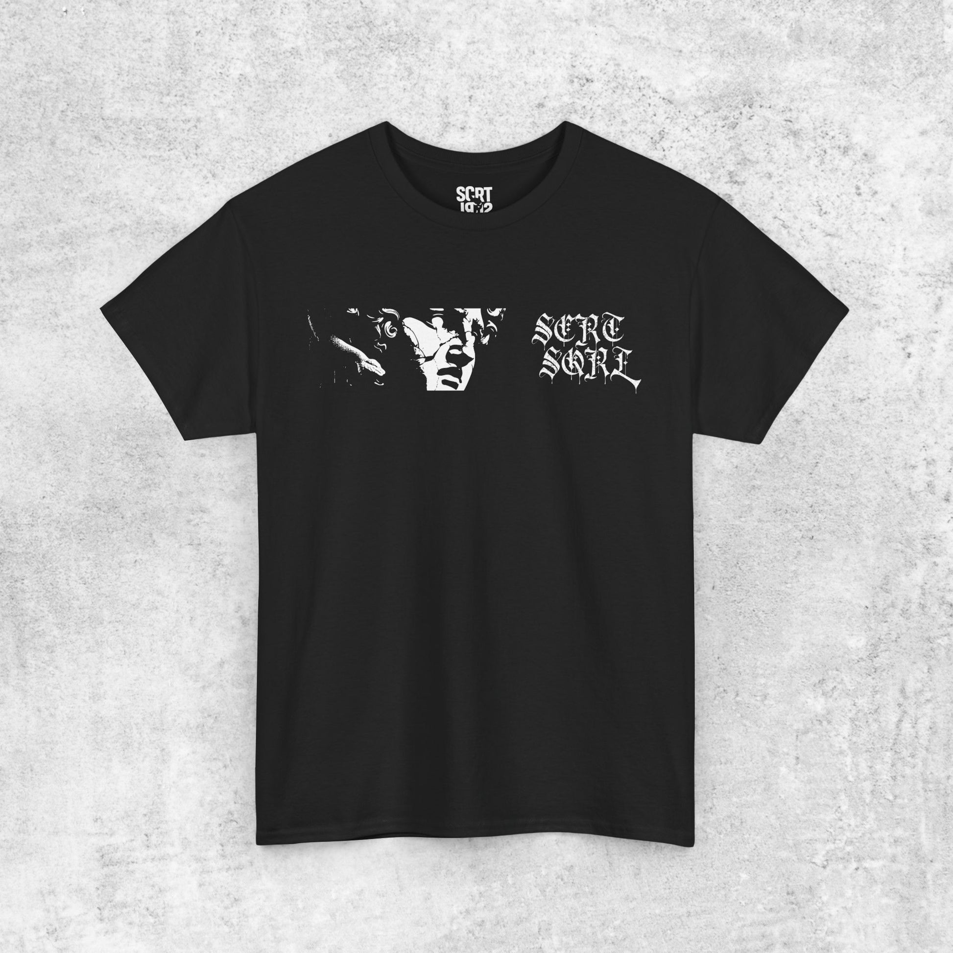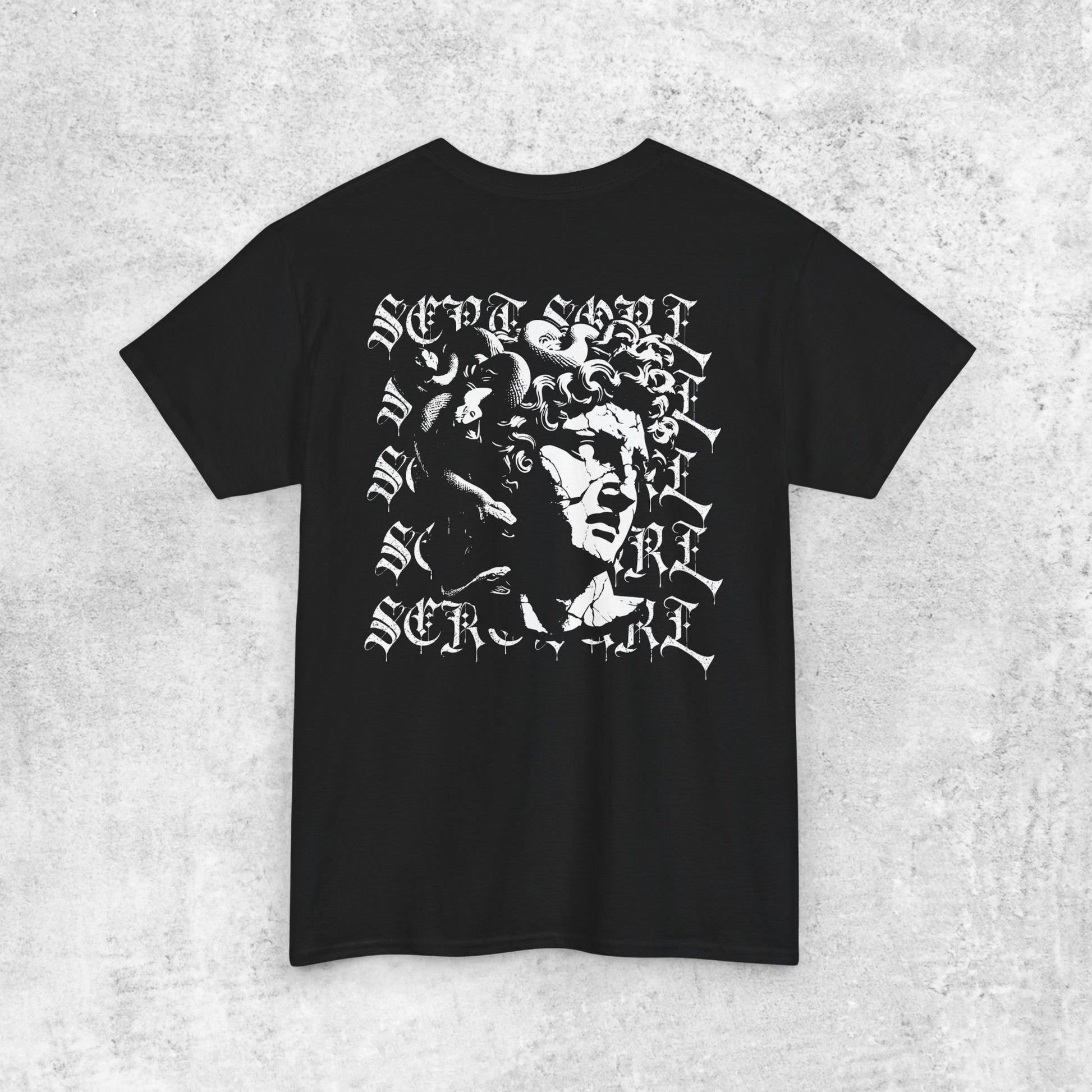 The “STONE COLD” Tee channels ancient chaos through a modern streetwear lens. On the back, Medusa’s head emerges from a snare of glitch-warped baroque elements and layered Old English SCRT SQRL calligraphy, blurring the boundary between myth and menace. Up front, the iconic SCRT SQRL chest logo keeps it sharp and understated. This drop is built for those who freeze the system with nothing but presence.