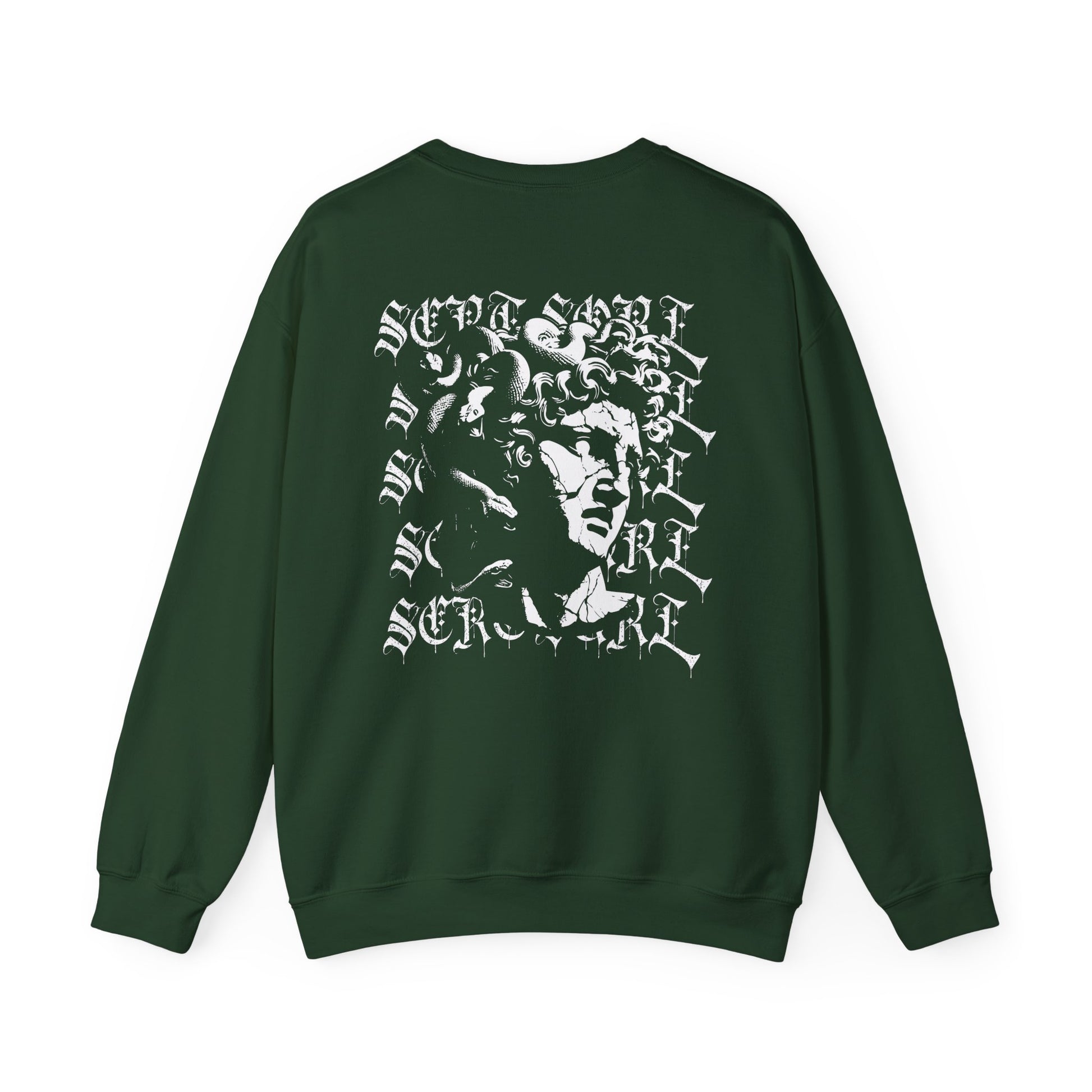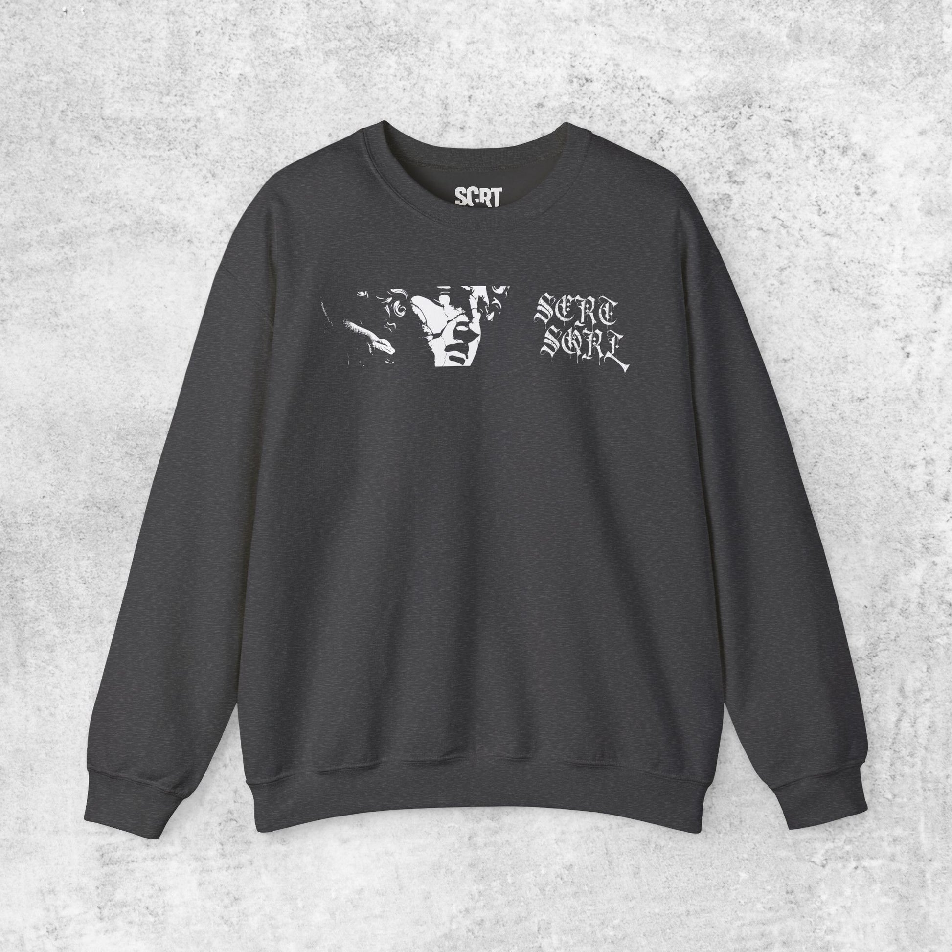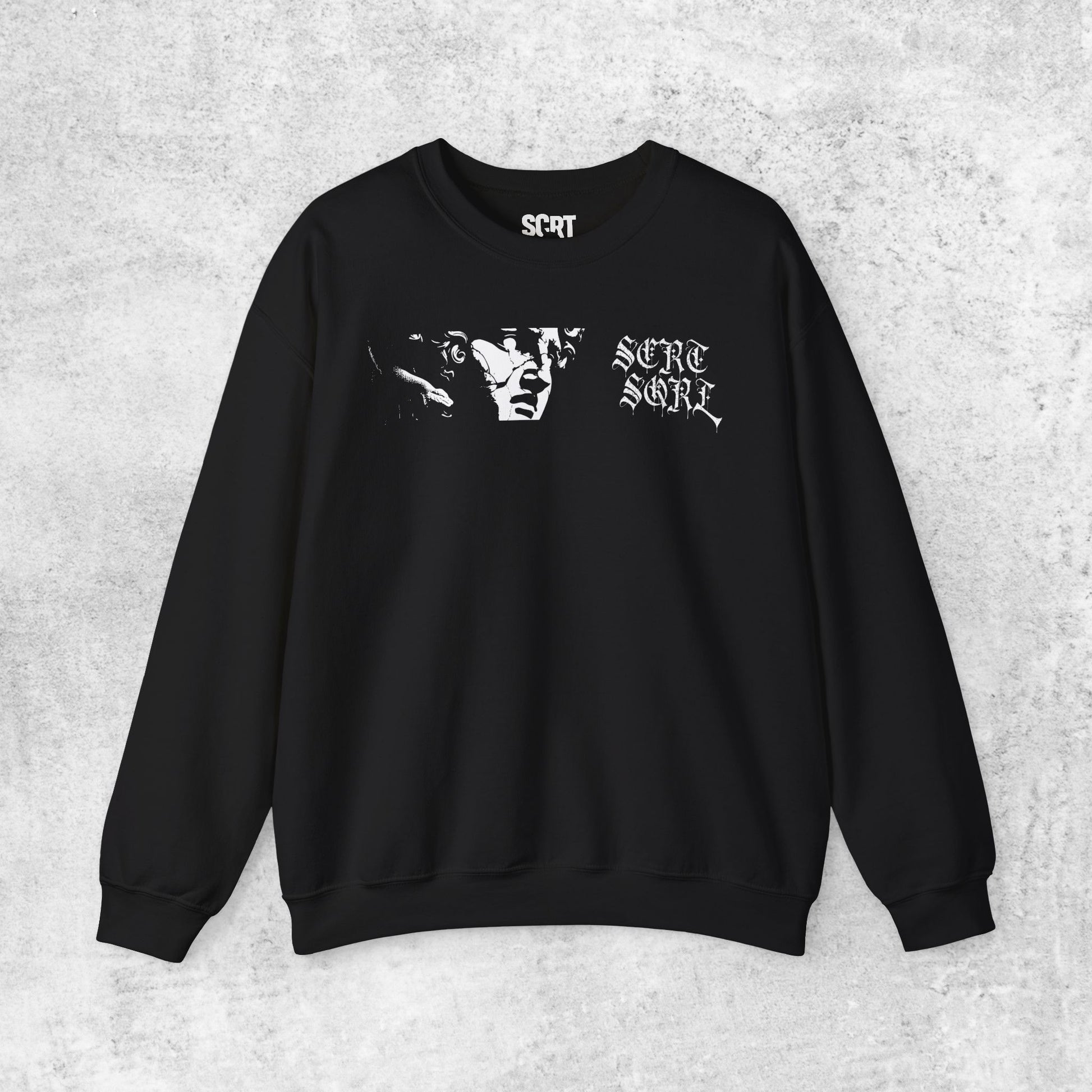 The “STONE COLD” Crewneck Sweater channels ancient chaos through a modern streetwear lens. On the back, Medusa’s head emerges from a snare of glitch-warped baroque elements and layered Old English SCRT SQRL calligraphy, blurring the boundary between myth and menace. Up front, the iconic SCRT SQRL chest logo keeps it sharp and understated. This drop is built for those who freeze the system with nothing but presence.