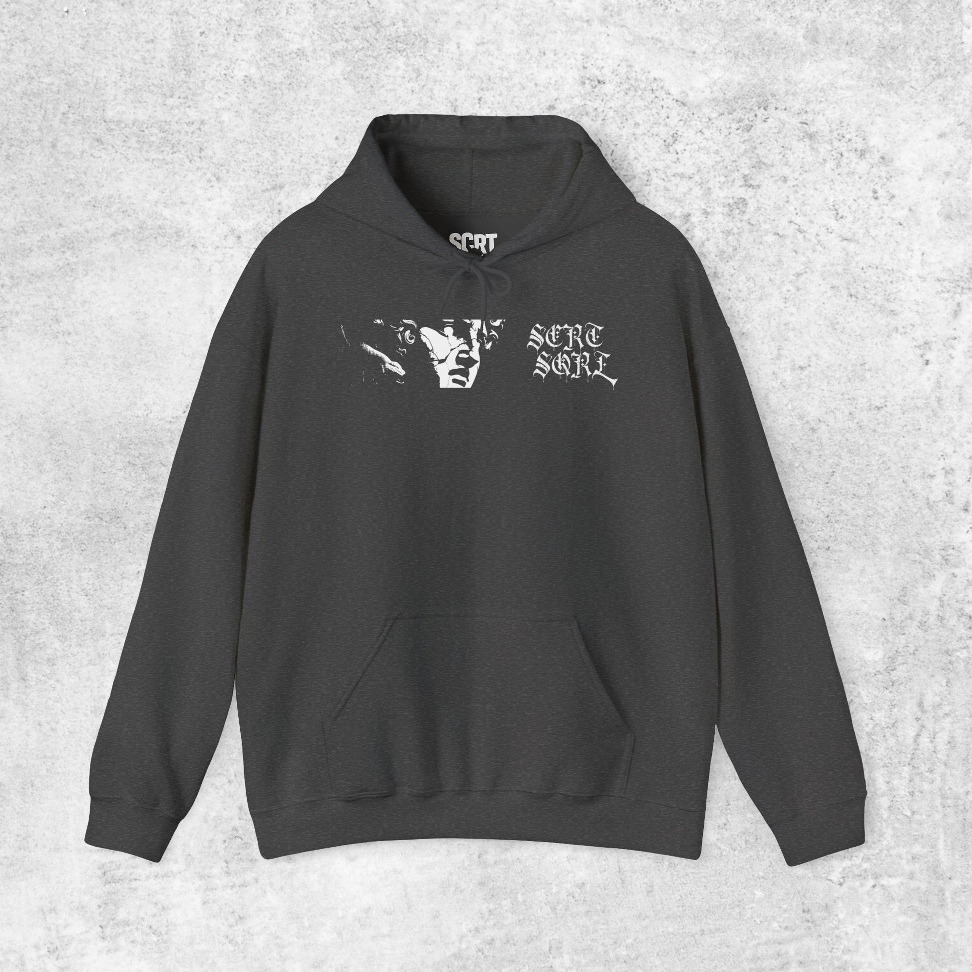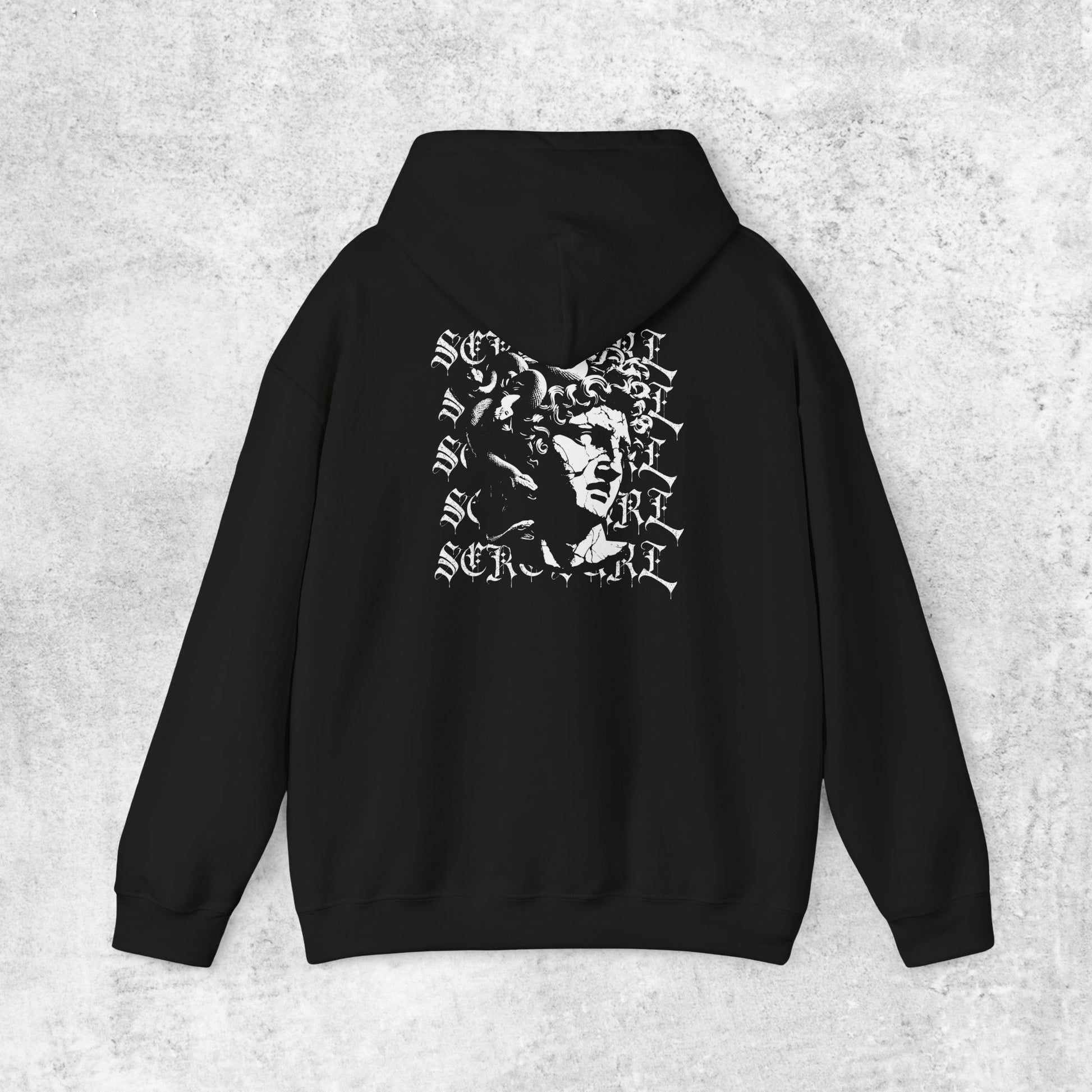 The “STONE COLD” Hoodie channels ancient chaos through a modern streetwear lens. On the back, Medusa’s head emerges from a snare of glitch-warped baroque elements and layered Old English SCRT SQRL calligraphy, blurring the boundary between myth and menace. Up front, the iconic SCRT SQRL chest logo keeps it sharp and understated. This drop is built for those who freeze the system with nothing but presence.